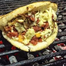 Éffiloché de trois viandes, tomate, oignon, cébette, mozzarella râpée, plantain sucré, poitrine de porc frit, maïs, avocat, oignons frits, sauce à la coriandre et à l’ail accompagner d’une salade verte en supplément 2€