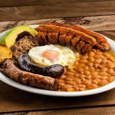 Haricots rouge, riz, salade, poitrine de porc frit, viande de bœuf effilocher, œuf, chorizo colombien et banane plantain mur.