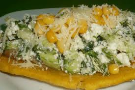 Tomate, oignons, maïs, mozza, plantain sucre, avocat, oignons frits